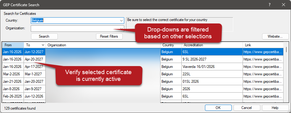 U kunt deze zoekfunctie openen via Help > Profiel > tabblad Certificaten > Certibase…
